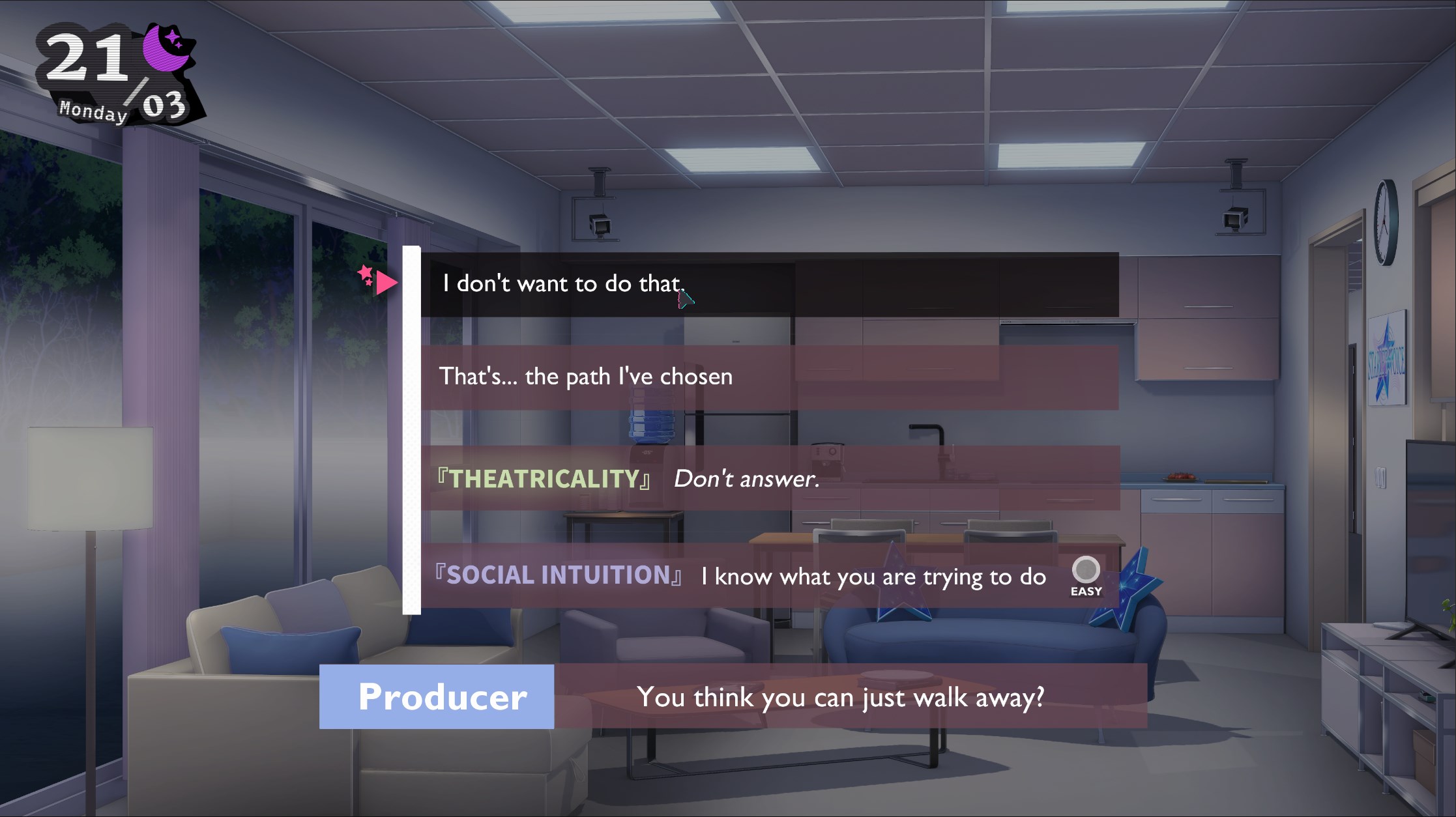A talent-show survival sim where love and performance are weapons against the death of fame.